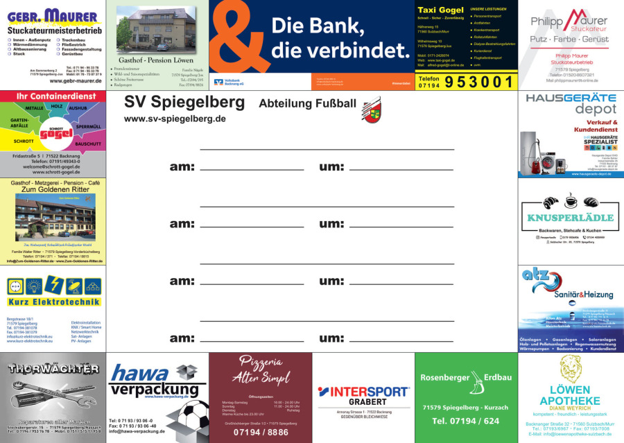 Als Partner des SV Spiegelberg unterstützen Sie aktiv den Verein und fördern zudem werbewirksam den regionalen Breitensport. Wir bieten Ihnen hierbei verschiedenste Möglichkeiten die Sichtbarkeit Ihres Unternehmens in der Region stärken: